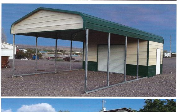 24 x 25 garage and 12 x 25 lean to all closed with two 9 x 7 roll up doors 24 x 35 carport storage vertical roof 10 x 8 roll up door 18 x 25 carport storage with one 10x8 rud window 12 x 25 lean to.